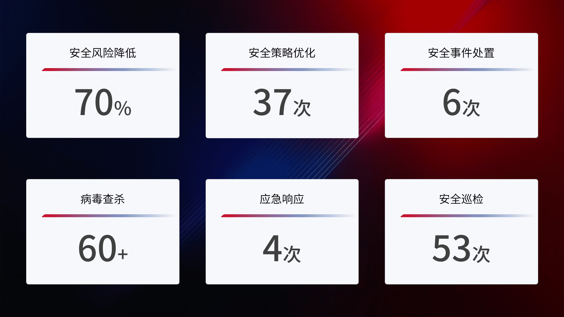 提供全面的安全事件报告体系,,,,包括处置报告、、、周报、、季度和年度总结,,,,结合持续监控,,,帮助客户深入了解网络安全状况。。。。