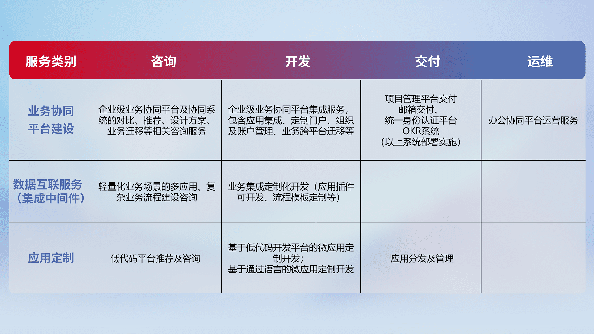 针对钉钉、、企微、、、IDaas等平台级产品提供产品的规划、、、方案、、、交付、、、定制化开发等服务,,,实现如统一协同办公、、、智能客户服务、、混合会议管理、、智能数据查询、、等业务场景,,,实现数字化转型。。。。